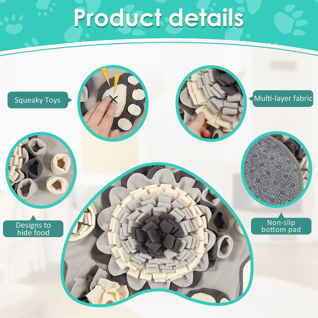 Perfect for sniff training, anxiety relief, and slow feeding, it features hidden pockets for treats, a built-in squeaker for excitement, and soft, pet-safe materials that are gentle on paws and noses.